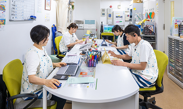 あおい会では、多様なスキルアップの機会を設けるとともに、職員同士、あるいは保護者とのコミュニケーションを円滑にするためのシステム導入、フレキシブルな働き方の推進を行い、働きやすい環境をととのえています。
